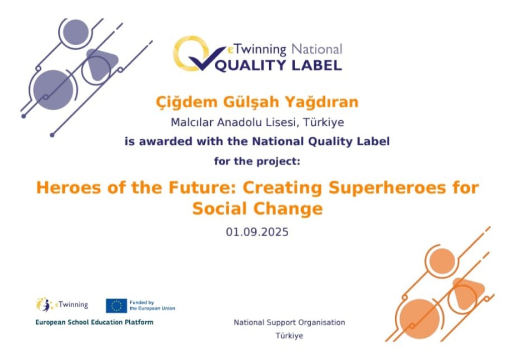 Okulumuz eTwinning projeleri ekibinin geçen sene kurucu olarak yürüttüğü "Heroes of the Future" konulu projesi kalite etiketi almıştır. Emeği geçen öğretmen ve öğrencileri tebrik ediyoruz.